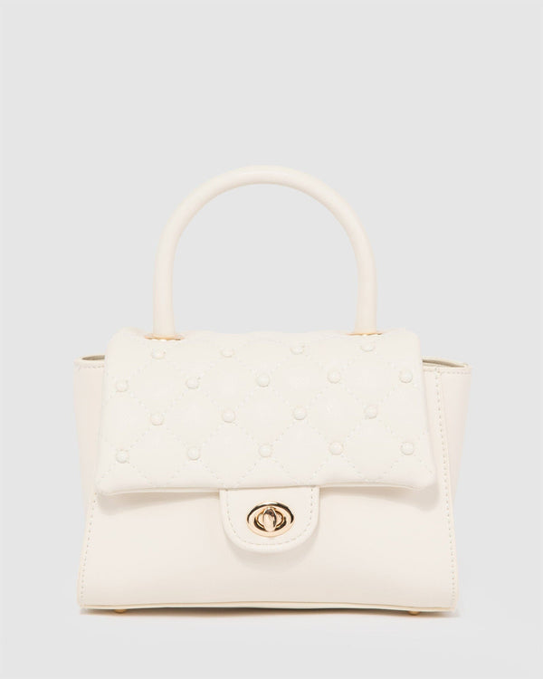 Part of our Fondant Fancy collection Ivory finish with Gold tone hardware Vegan leather Quilted and stud details Twist lock closure Fixed top handle Internal zip pocket Ivory lining with...