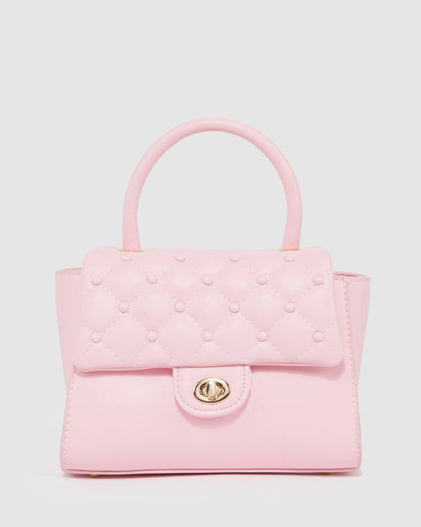 Part of our Fondant Fancy collection Pink finish with Gold tone hardware Vegan leather Quilted and stud details Twist lock closure Fixed top handle Internal zip pocket Ivory lining with...