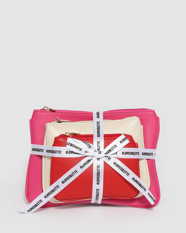 Part of our Think Pink collection Multi colour finish with gold tone hardware Textured faux leather Zip closure Set of 3 purses wrapped in ribbon Measurements: Small red purse H12.5cm...