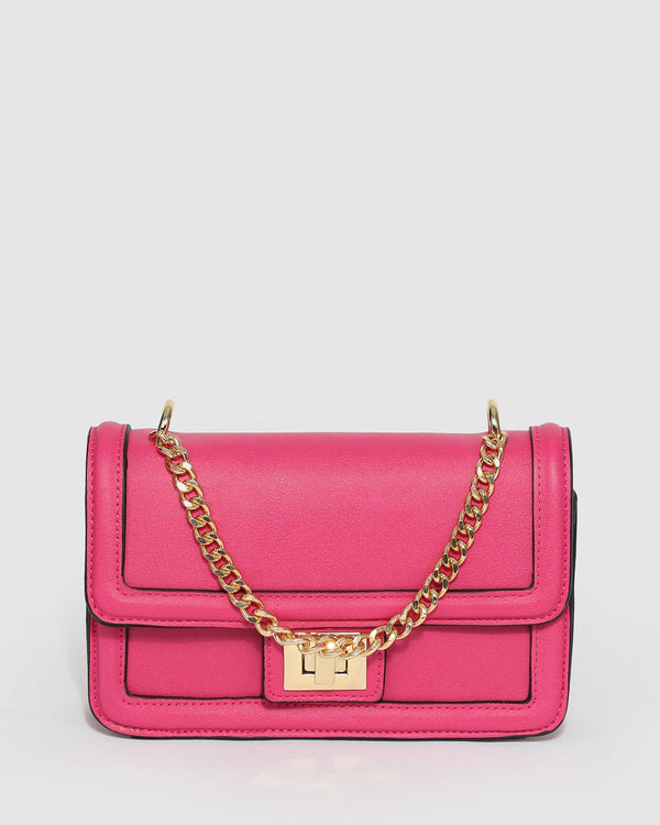 Part of our Think Pink collection Pink finish with gold tone hardware Textured faux leather Turn lock closure Internal zipped pocket 3 Internal card slots Fixed chain Detachable adjustable shoulder...