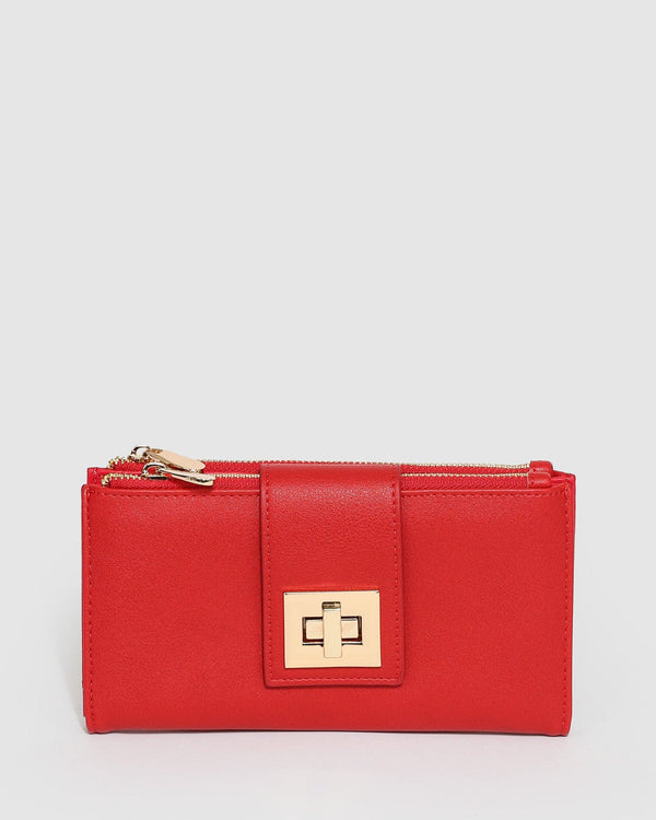 Part of our Think Pink collection Red finish with gold tone hardware Textured faux leather Turn lock closure with foldover flap 14 card slots Clear photo ID window 4 note/slip...