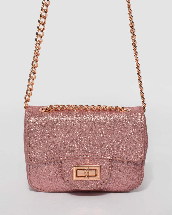 Part of our Tropi Cool collection Rose gold finish with rose gold tone hardware Glitter material Turn lock closure Fixed chain shoulder strap Pink nylon lining with colette by colette...