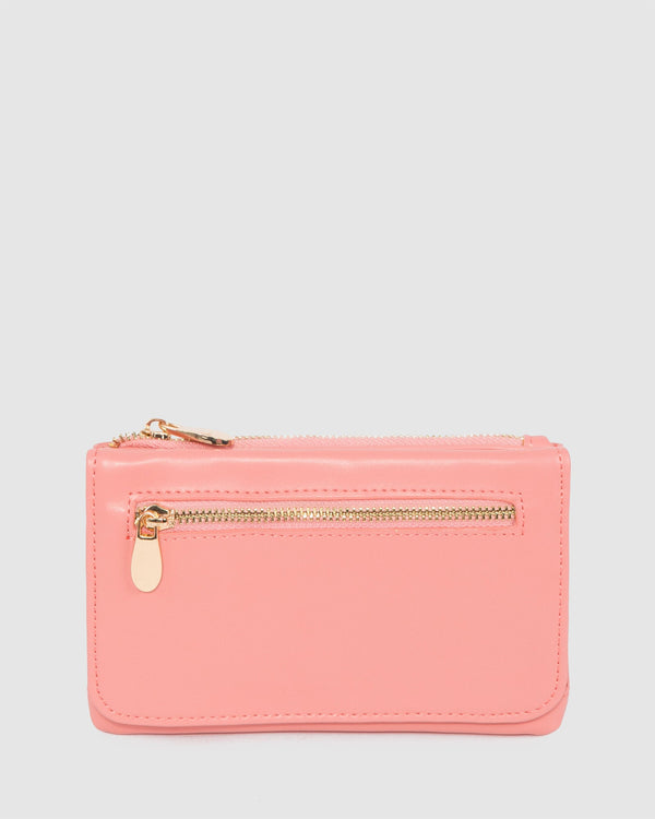 Part of our Palm Royale collection Coral finish with Gold tone hardware Vegan leather Press stud closure Zip compartment External zip pocket 8 credit card slots Note slot Internal slip...