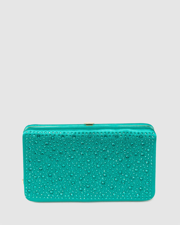 Part of our Bejewelled collection Green finish with Gold tone hardware Satin finish with crystal details Push lock closure Internal slip and zip pockets 8 credit card slots Elastic phone...