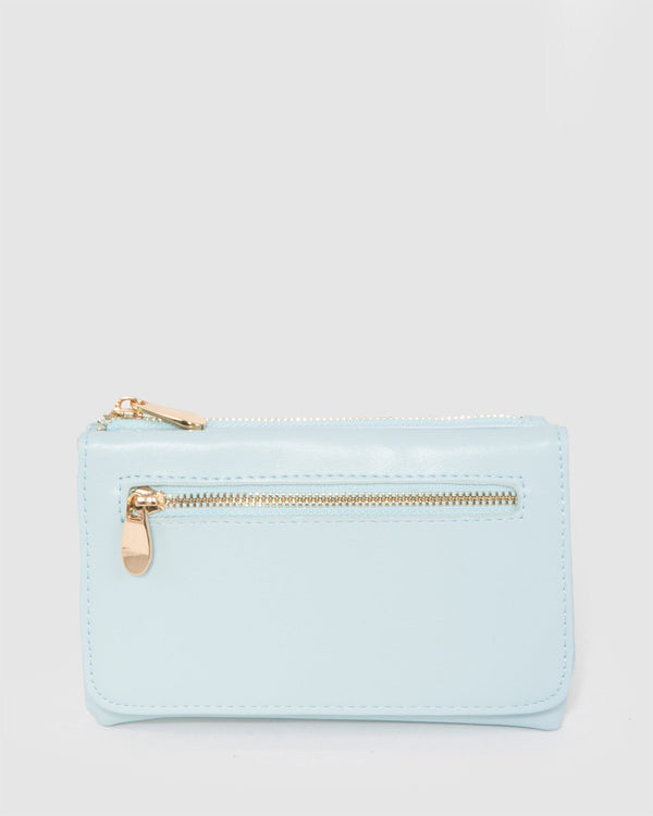 Part of our Palm Royale collection Light Blue finish with Gold tone hardware Vegan leather Press stud closure Zip compartment External zip pocket 8 credit card slots Note slot Internal...