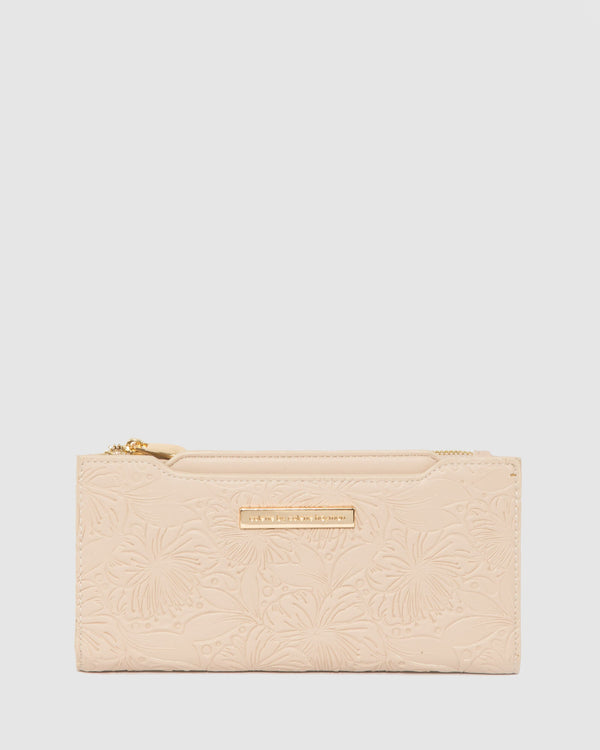 Part of our Emboss collection Natural finish with Gold tone hardware Vegan leather Embossed detail Press stud closure Zip compartment Note slot 10 credit card slots Removeable note and card...