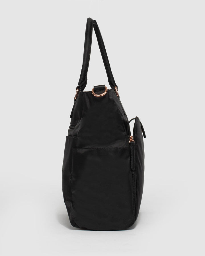 - Black finish with rose gold tone hardware