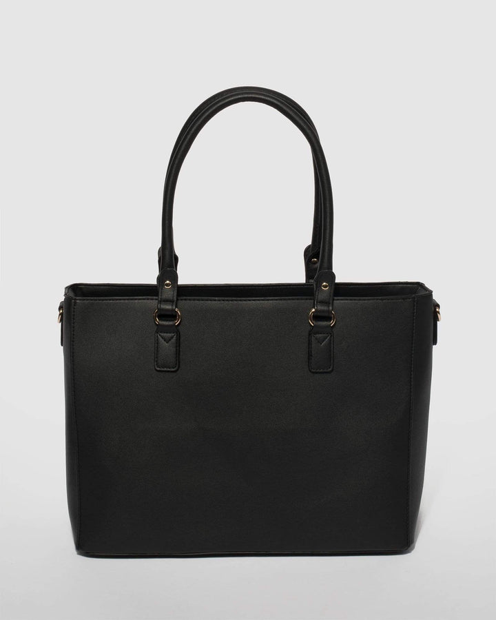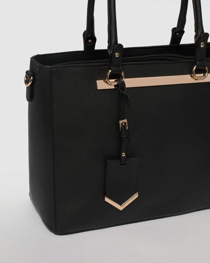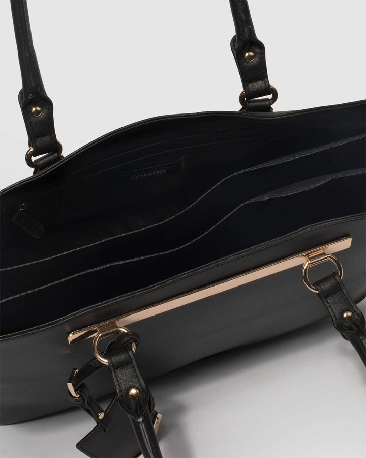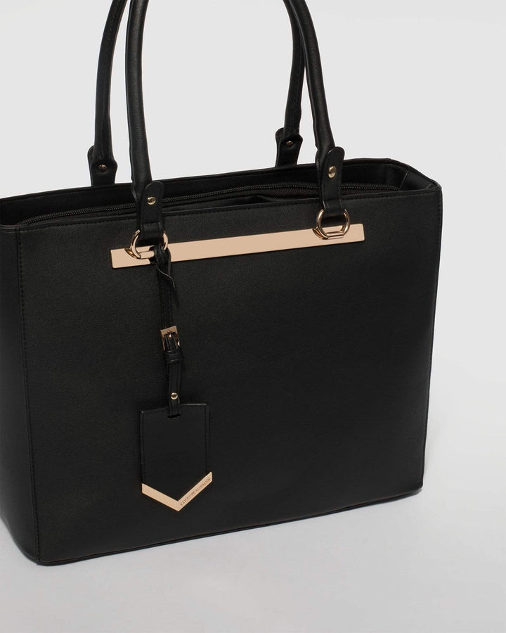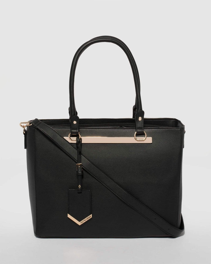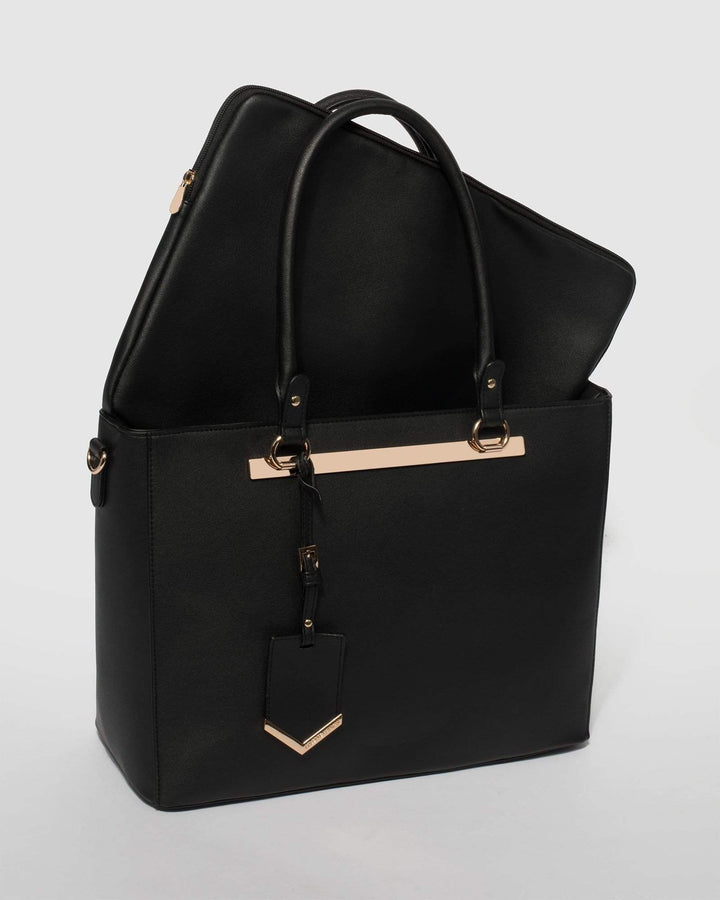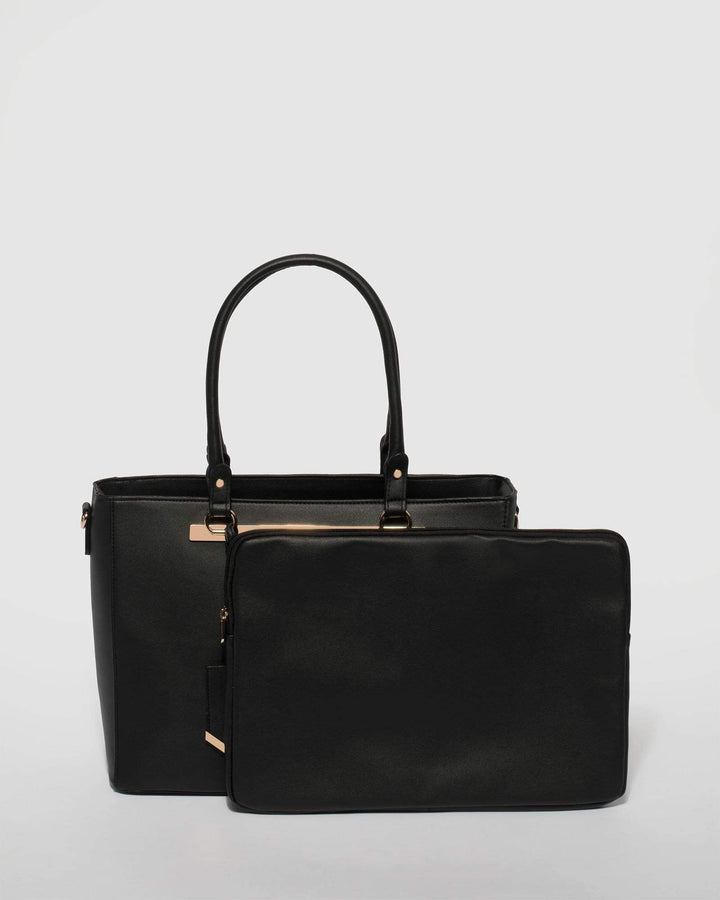 Our Premium Tech Tote Bag fits all of your daily essentials with the convenience of the removable laptop pouch. Perfect for travel, work and school.- Black finish with gold tone hardware