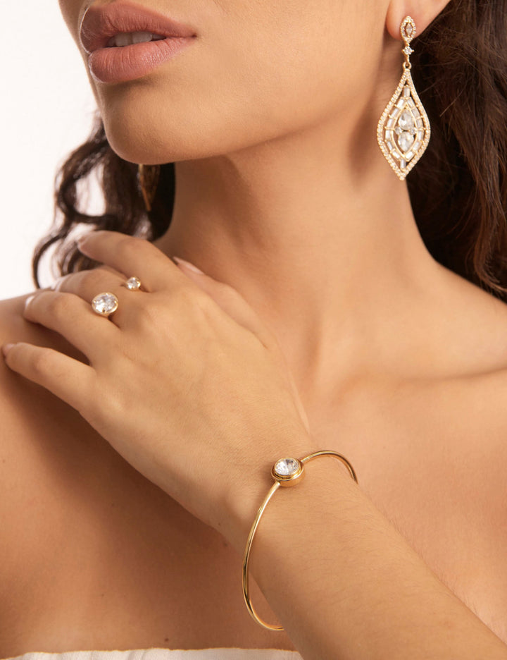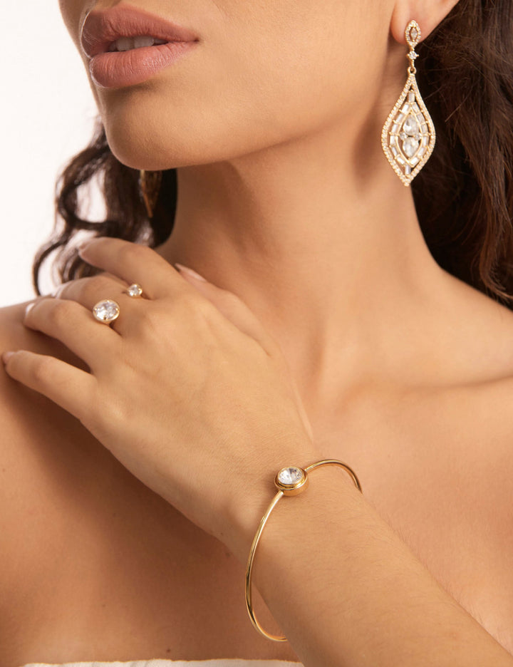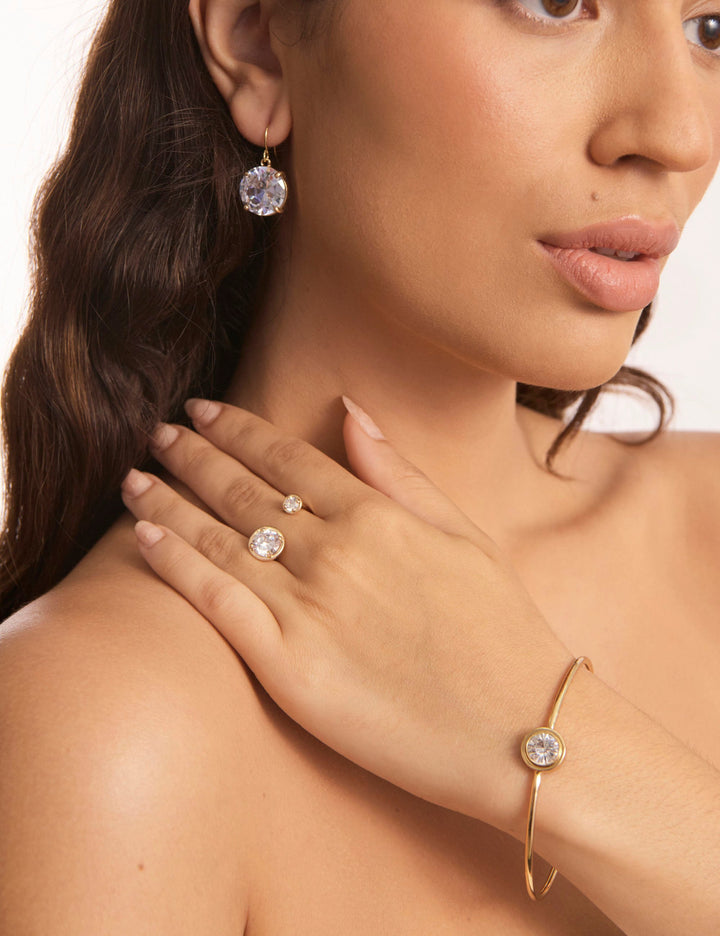 This simple-yet-stunning ring is adorned with faceted, reflective crystals that elevate every outfit. The Duo Crystal Stone Set Ring capture stunning contemporary style with a classically elegant finish, featuring bright gold-coloured plating set with beautiful sparkling stones, perfect for finishing your favourite day or evening looks.