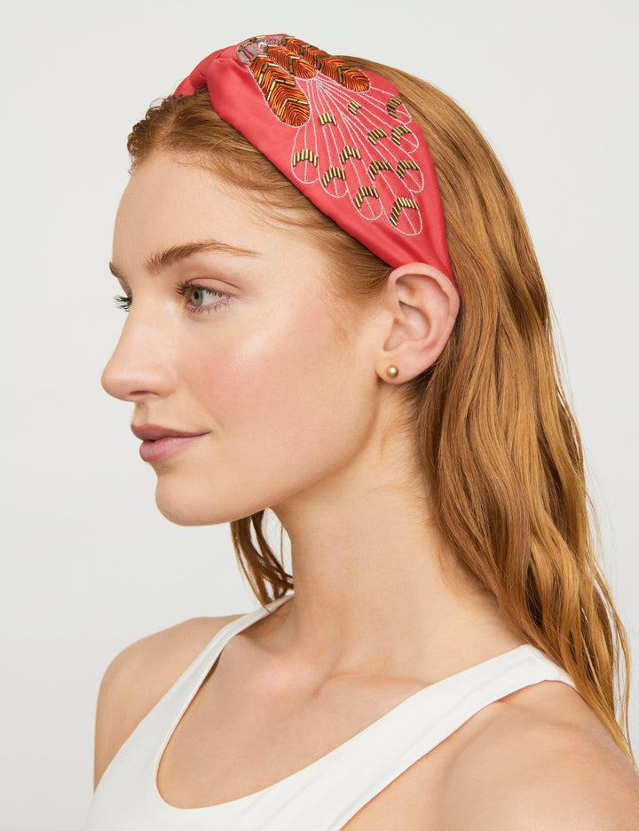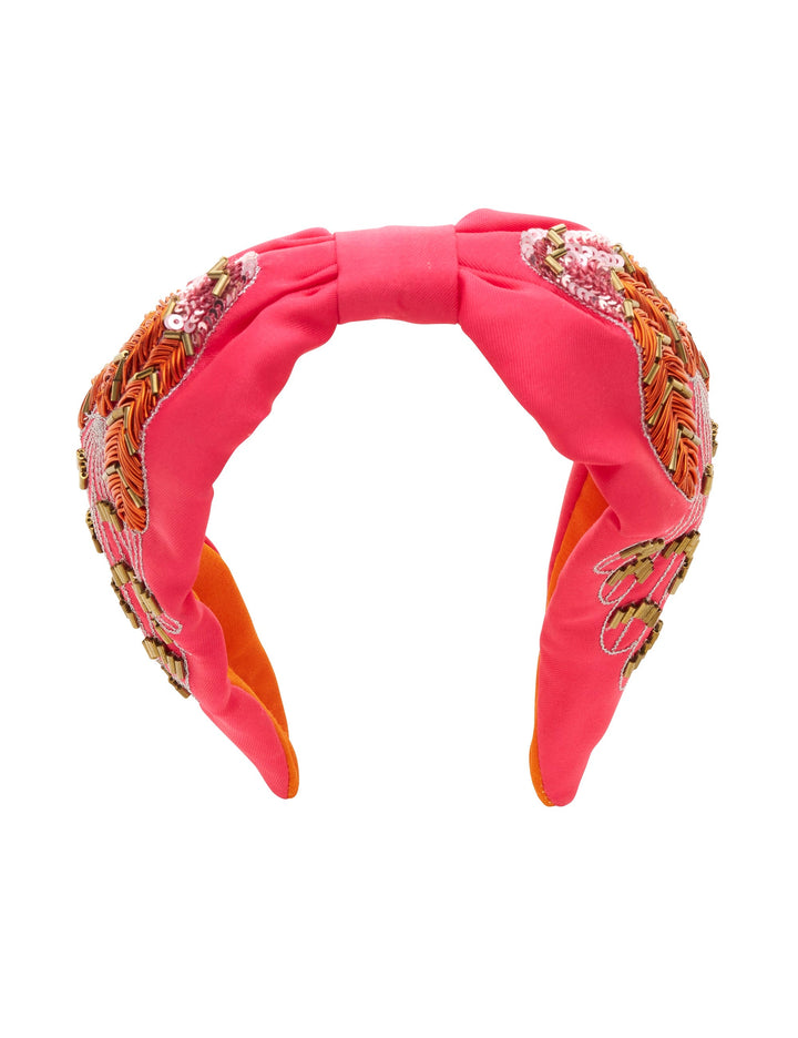 In vibrant pink, the Feather Bead and Embroidery Wide Knot Headband is perfect for bringing a bold finishing touch to your outfit. This wide headband features a knot accent, an embroidered feather design, and fine bead and sequin detailing, bringing statement colour and a hint of sparkle to your springtime wardrobe.