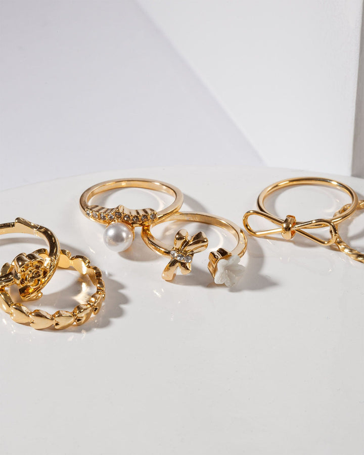 Gold Multi Pack Flower And Bow Rings