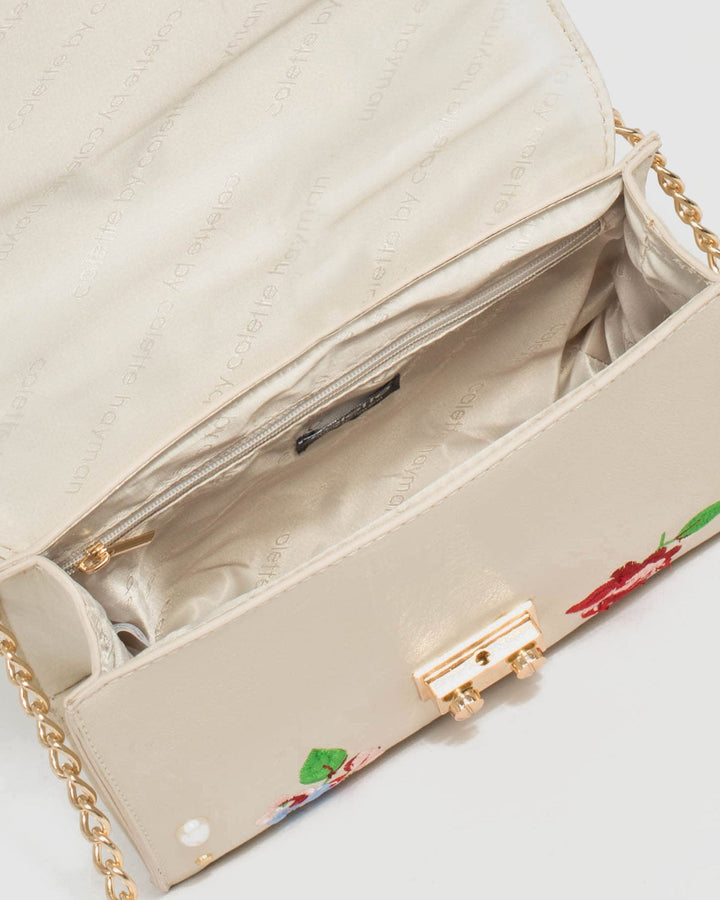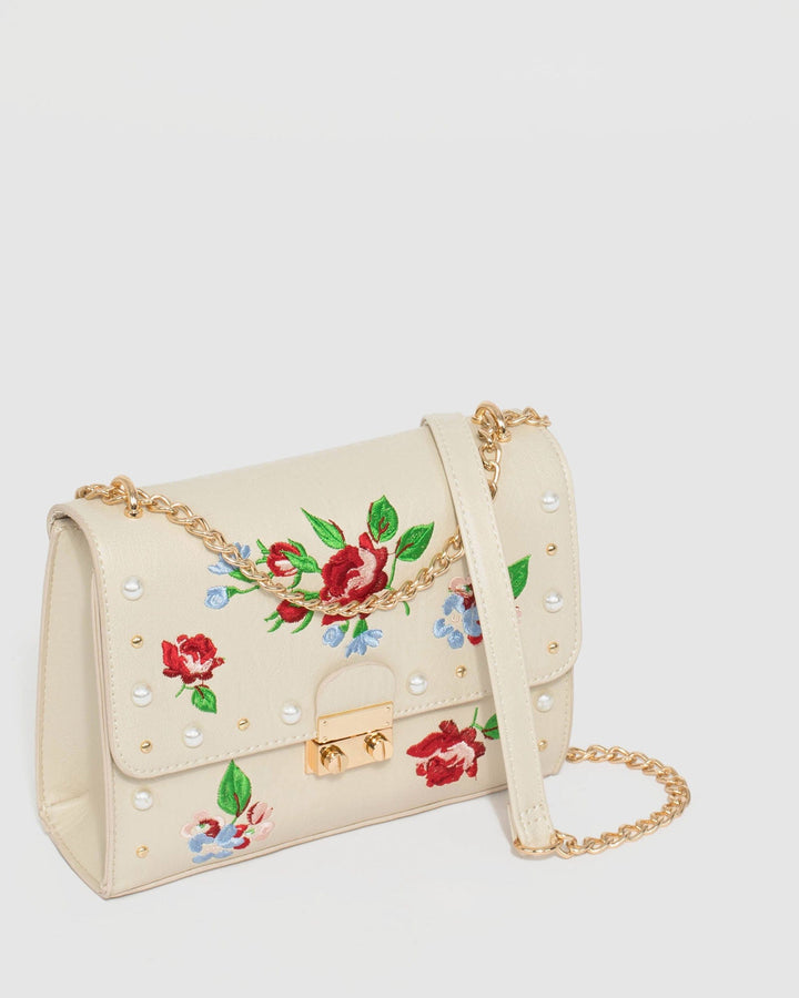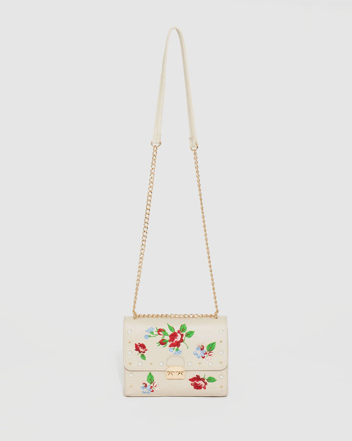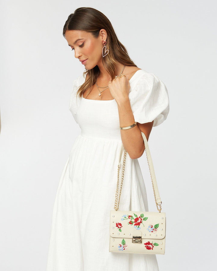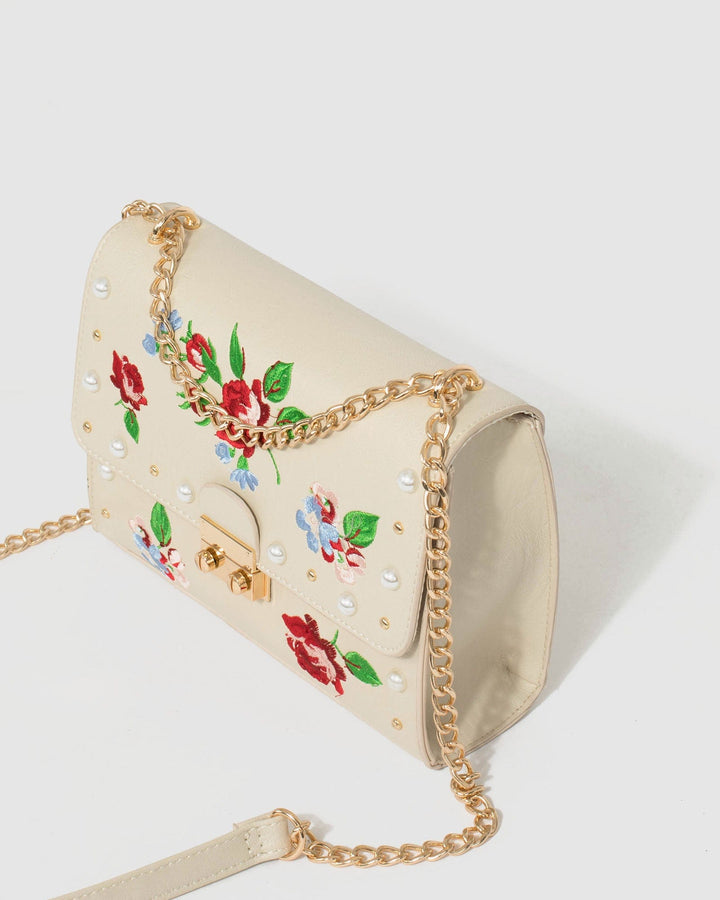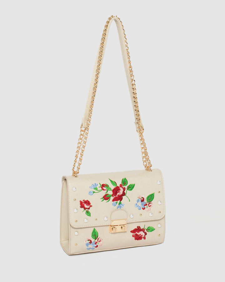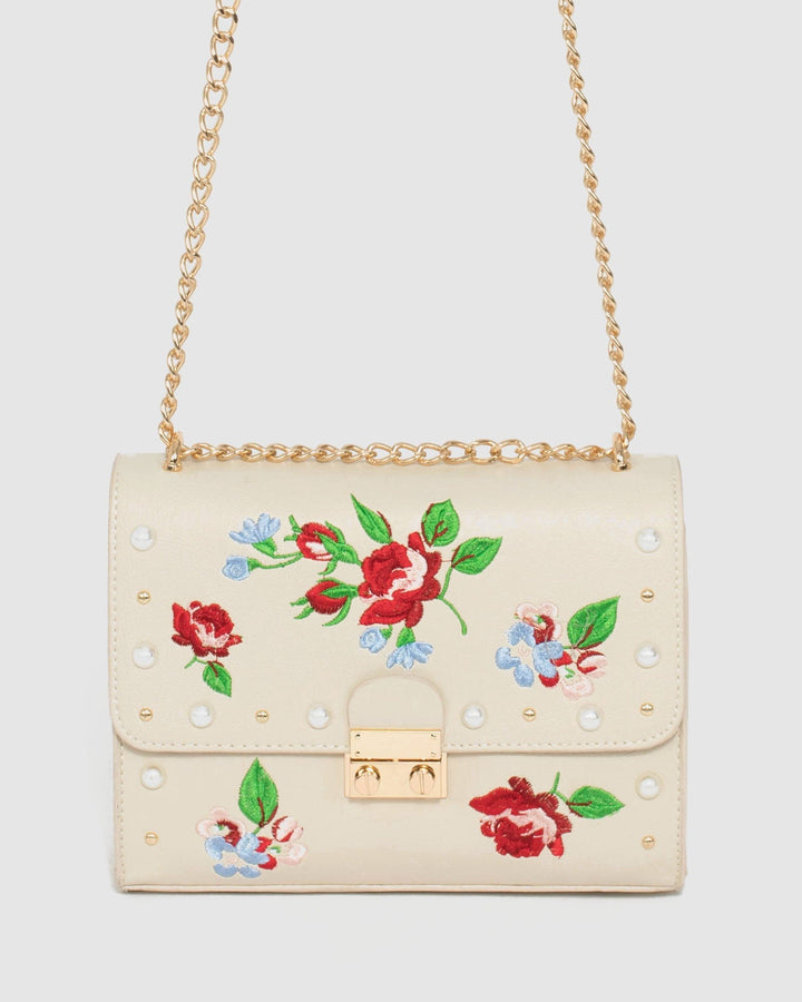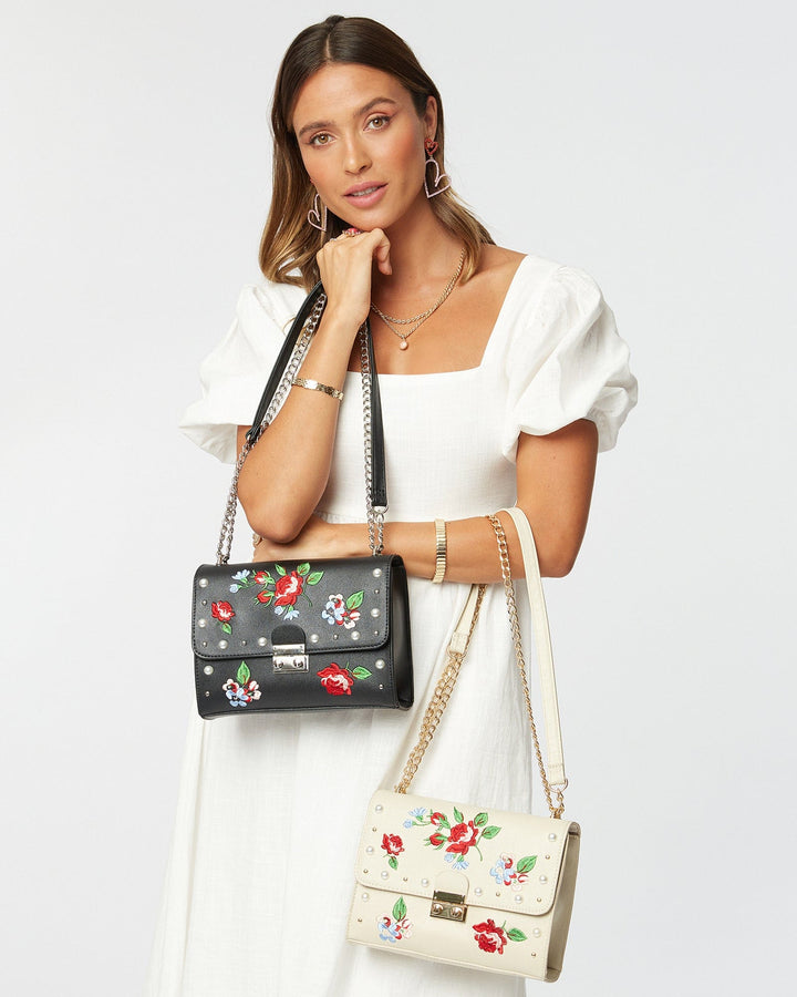 - Textured faux leather with embroidery and gold/pearl embellishments