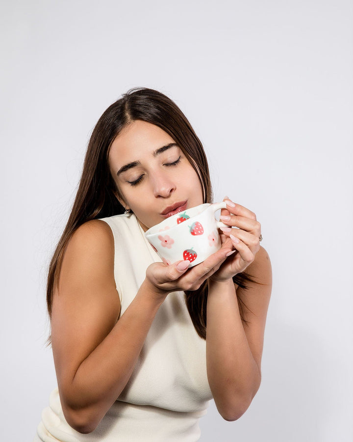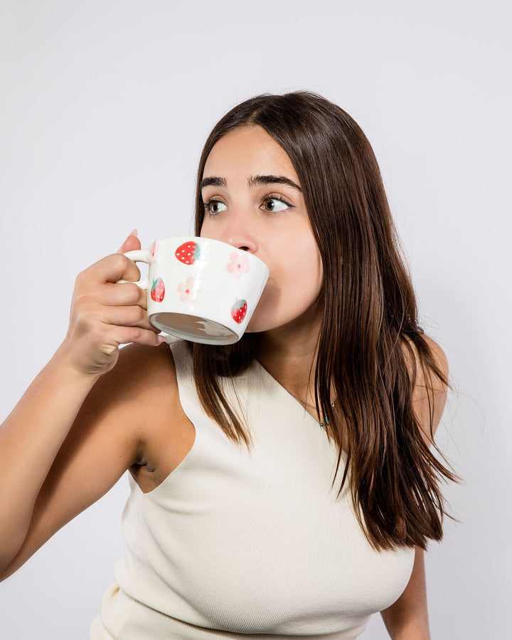 This delightful mug is adorned with a charming design featuring vibrant strawberries and flowers. Crafted from high-quality ceramic, it's both durable and eye-catching, adding a touch of elegance to your morning coffee or afternoon tea.