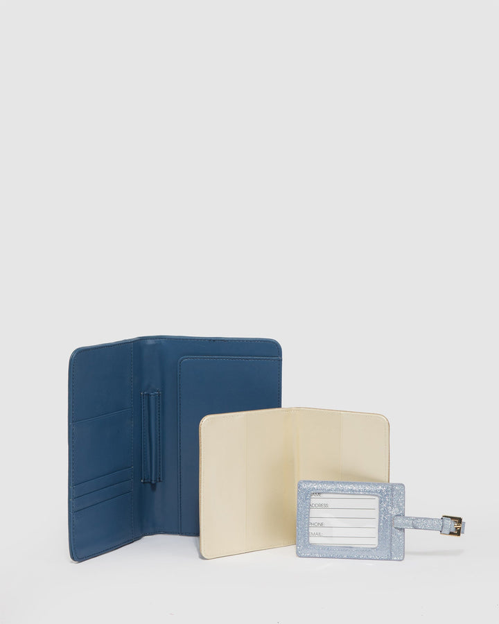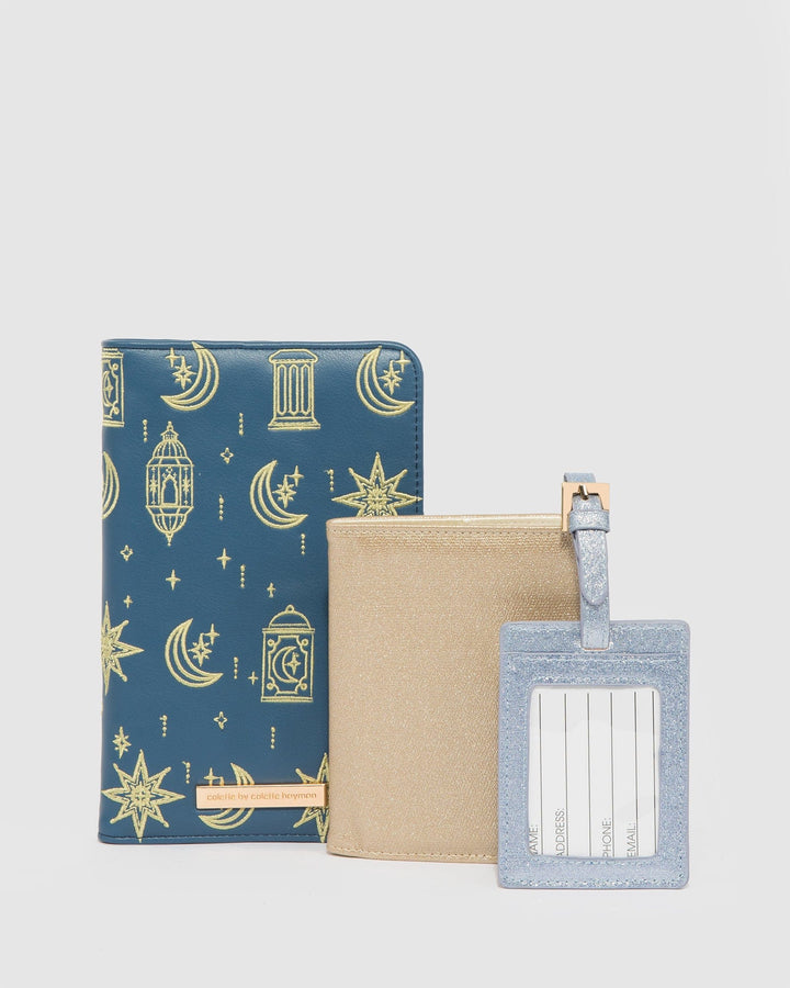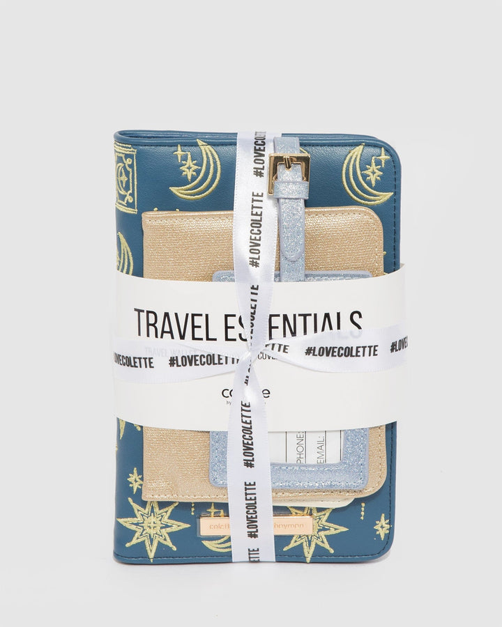 Our travel essentials pack contains a travel wallet, passport cover and luggage tag.
