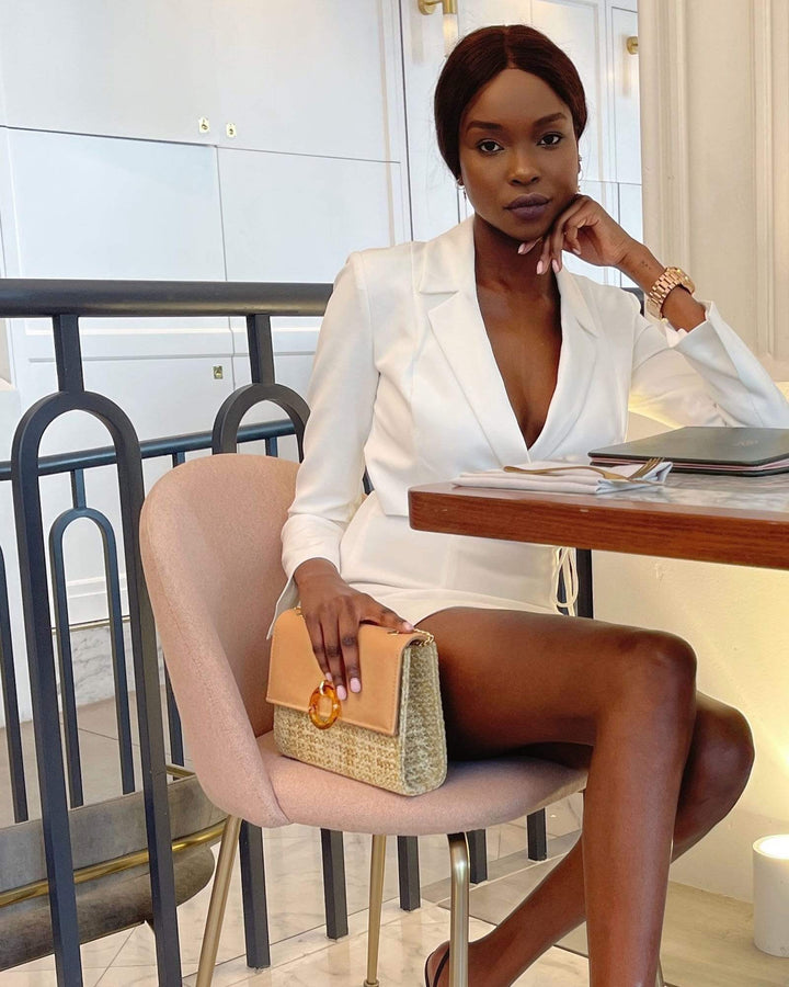 - Smooth faux leather and natural weave