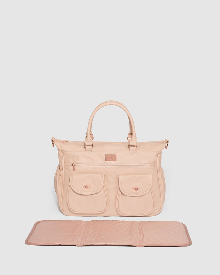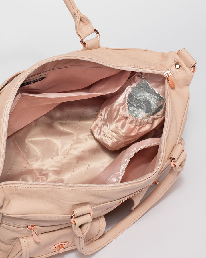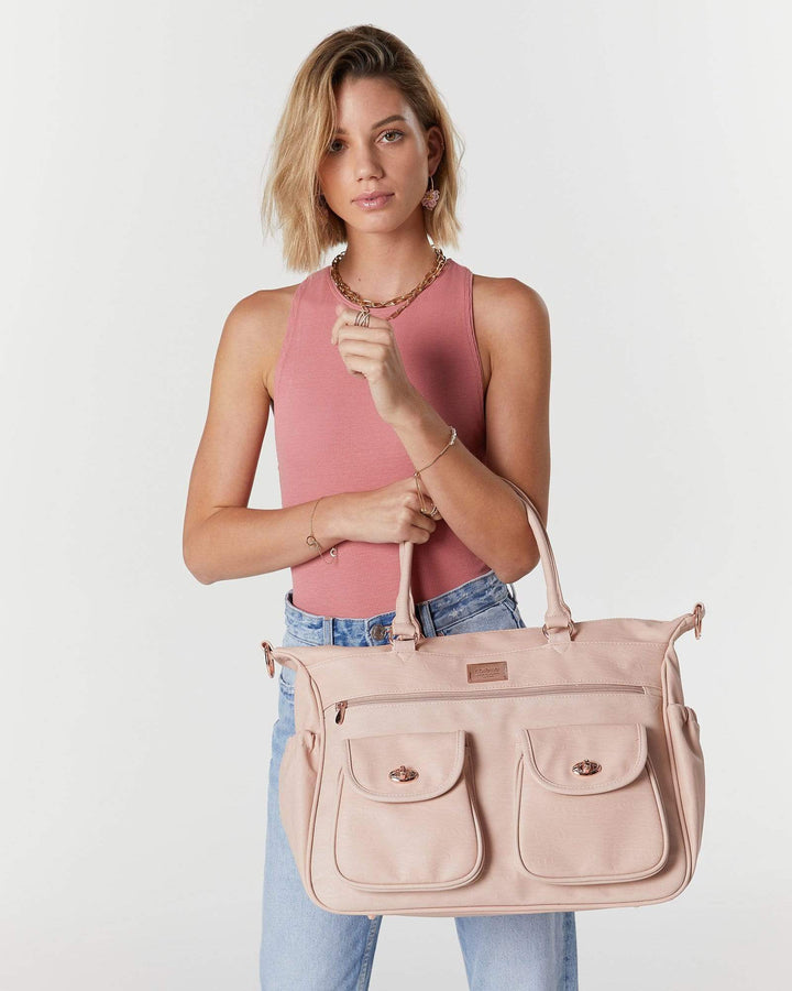 This stylish and practical baby travel bag is finished in a pretty pink hue with rose gold tone hardware. Made from smooth faux leather, the bag features a zip closure to the main compartment, as well as an external zip pocket for quick access to essentials. There are also 2 external slip pockets which are secured by magnetic closure, and elasticated side pockets for holding bottles or snacks. The bag also comes with a removable changing mat which is secured by a velcro slip pocket on the rear, and an internal insulated pocket for bottles. Finally, the bag has a detachable adjustable shoulder strap.