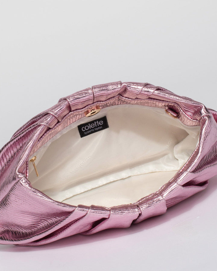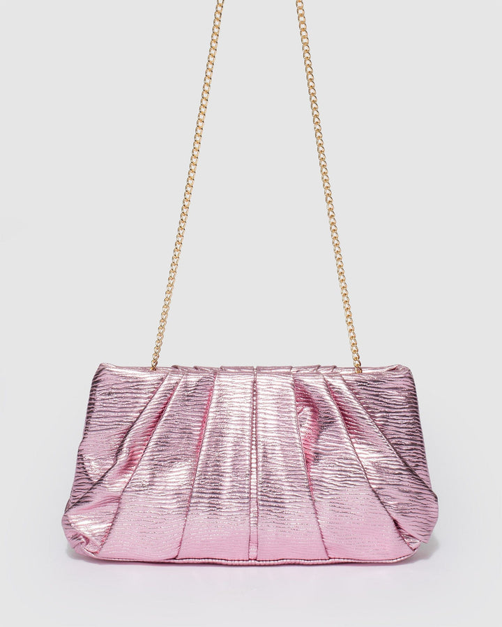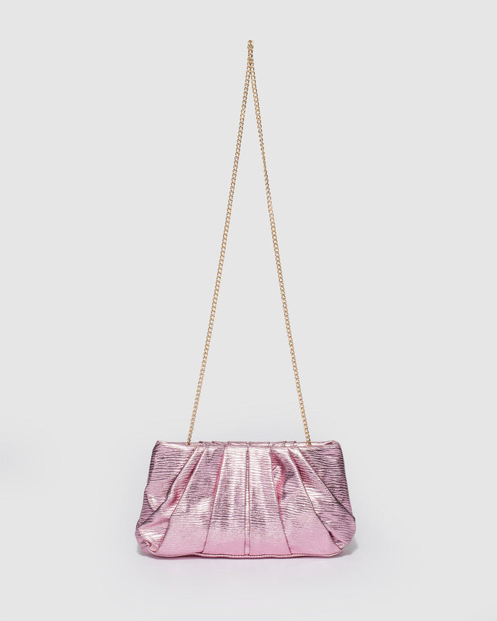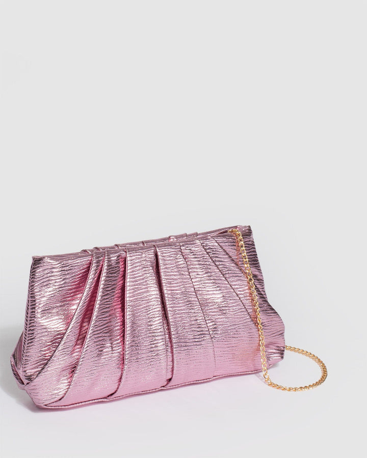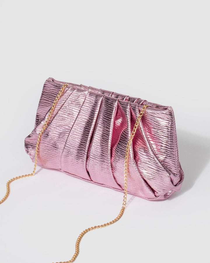 - Pink textured metallic finish with silver tone hardware