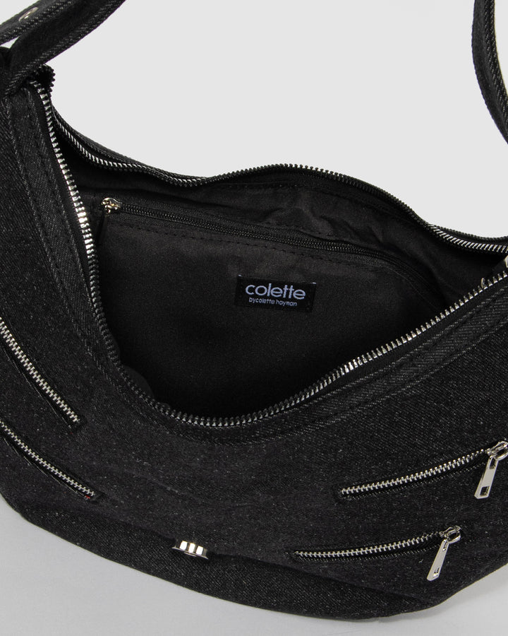 - Black denim finish with silver tone hardware